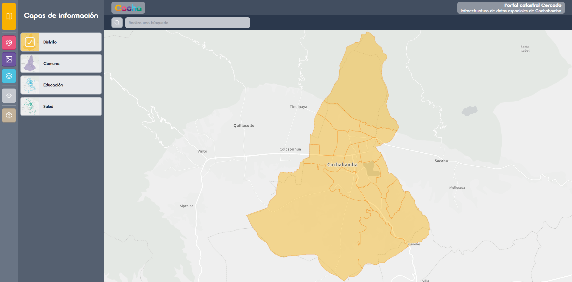 A map portal designed to be used by the citizens of Cochabamba/Bolivia in a way that can be intuitive and easy to use, developed in the installations of Cadastre Cercado.